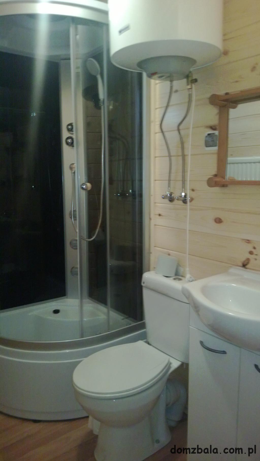 - Łazienka wyposażona w prysznic, umywalkę z szafką, WC, termę.